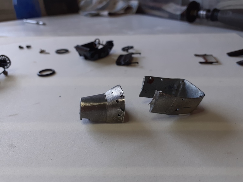 Tout d'abord il a fallu démonter la voiture. Dans un premier temps je croyais que les 21 premières pièces suffiraient, mais au final presque trente (on ne croirait pas!!!) Ici on voit la pièce qui va occuper la majeur partie de mon temps. J'ai mis une pièce de 1€ à côté pour vous montrer les 3cm sur lesquels je vais oeuvrer. La découpe commence et ne restera que le capot, la carrosserie disparait maintenant. Je commence par fabriquer la baie de pare brise Qui est suivie par les montants latéraux