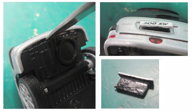 Insérer la lame d'un canif entre la caisse et le plancher pour donner du jeu puis toujours avec une lame retirer la plaque d'immatriculation (qui est collée).