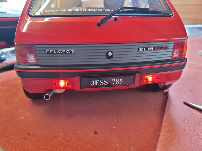 Voilà ma peugeot 205 GTI IXO est pratiquement finie ,j'ai modifié l'éclairage ,à savoir les longues-portées fonctionnent ,les clignotants aussi (ils clignotent vraiment ,mais je n'ai pas pu partager la video ) les feux anti-brouillard fonctionnent aussi ,le tout alimenté par une pile bouton dissimulée ddans une "caisse à outils" Facom fabriquée à partir d'une boite d'allumettes et dissimulée dans le coffre arrière .