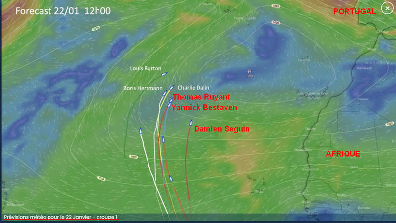 Le groupe de tête navigue maintenant au Nord de l’anticyclone dans un vent qui va adonner (Tourner dans un sens favorable à la marche d’un voilier) avec des empannages (manœuvre délicate qui consiste à changer le côté duquel le voilier reçoit le vent par l’arrière) à la clef . Le positionnement et le timing des empannages sera important. La gestion de la petite dépression secondaire (pour rester le plus longtemps possible dans le vent fort, dans son Est) sera également l’une des clefs du bon cap vers les Sables d’Olonne .