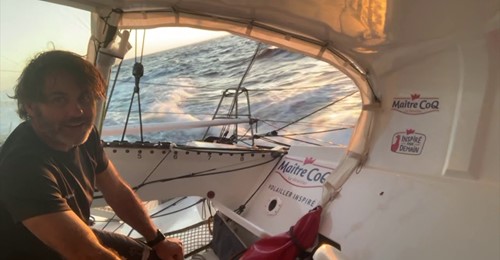 « Je suis dans des alizés d’Est entre 17 et 18 nœuds : je peux donc remonter assez vite vers les Açores ! Ce n’est pas mal du tout surtout que je suis sous-toilé devant et sous-toilé derrière parce que j’ai des problèmes avec mon J2… alors je suis en équilibre instable côté voilure…